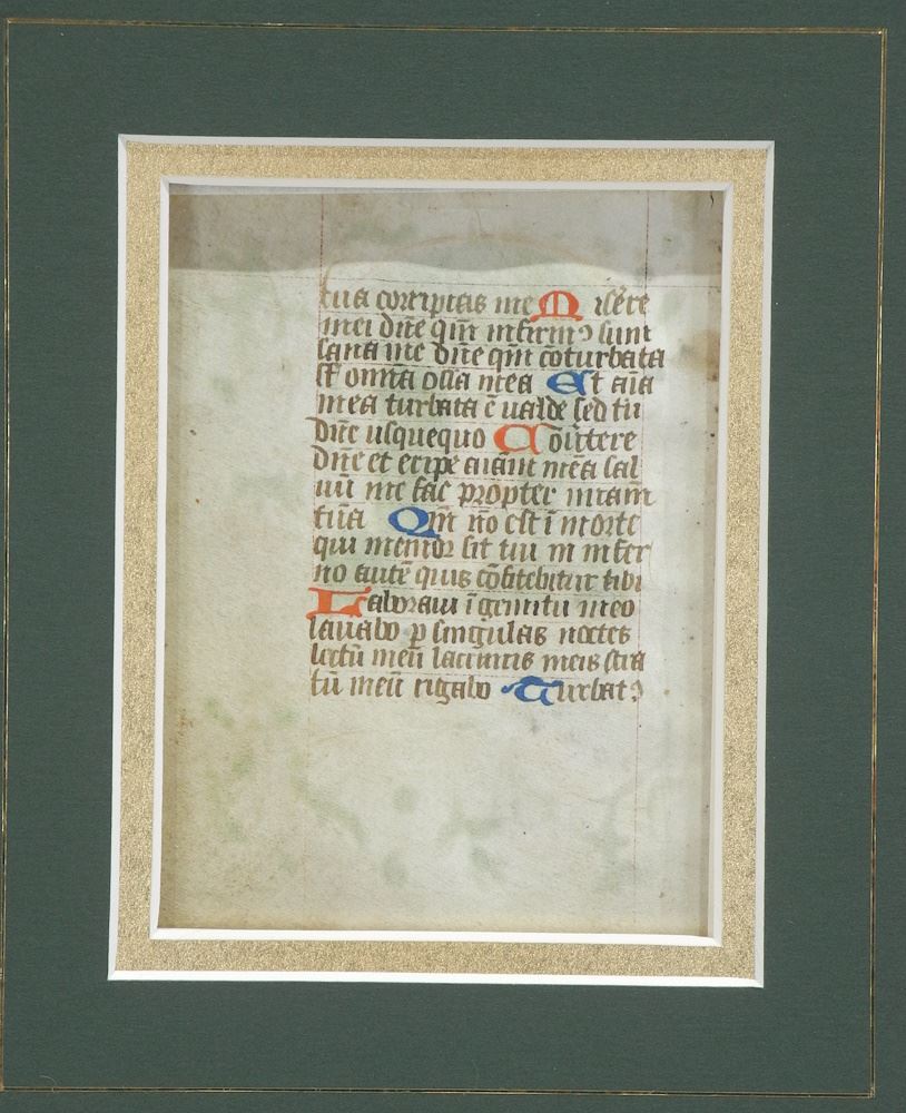 Medieval Illuminated Manuscript Leaf, 3 1/4 x 2 1/2", Double Glazed.