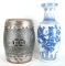 Chinese Silver Finish Garden Seat (18"h) & Blue & White Vase