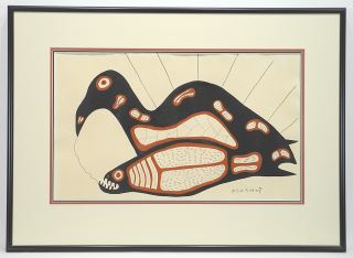 LOT 128 Ink & Tempera on Paper signed Norval Morrisseau, 13 3/8 x 22 1/2", "Loon & Fish". Estimate: $2,000 - $3,000 Sold For: $1,900 Auction Date: Tuesday, March 10 2026 at 4:00 PM