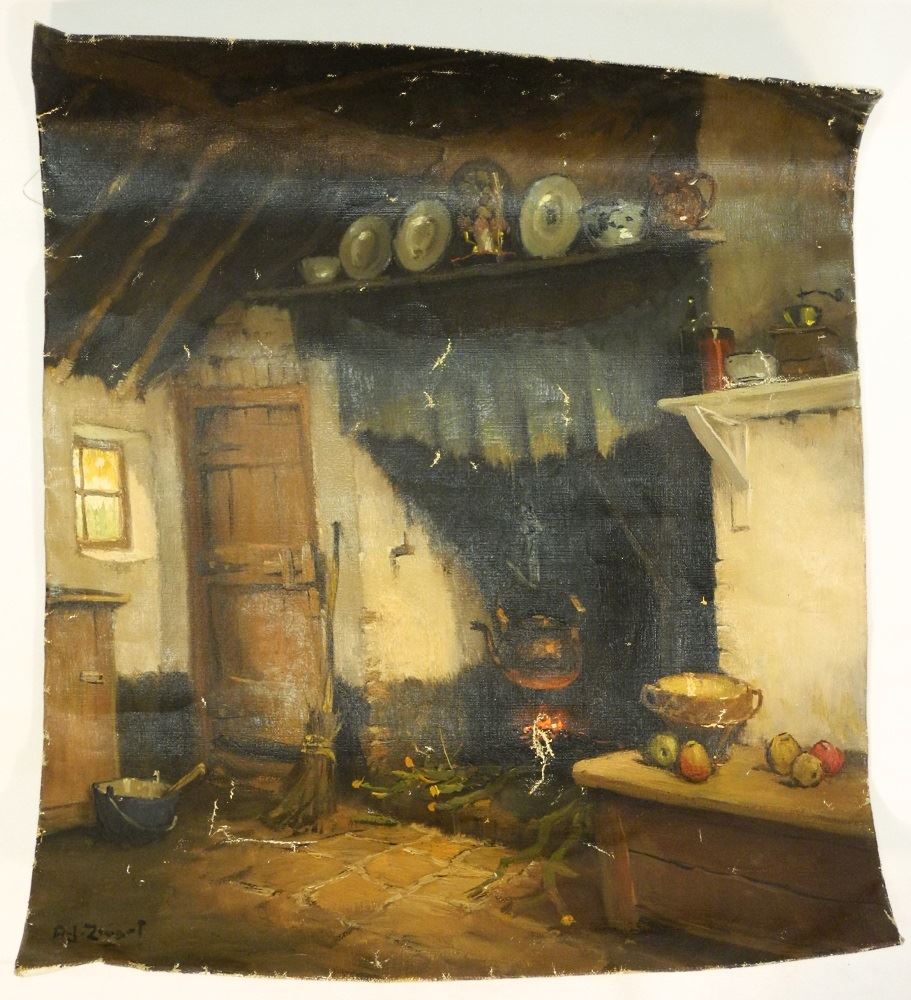 Oil on canvas signed A.Zwart (Arie), 28 3/4" x 25 1/4", "Oud Brabants, Interieur...", unframed.