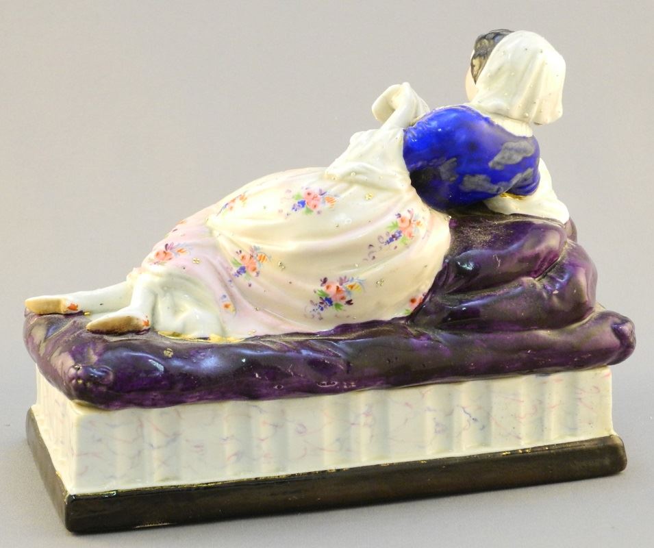 19th Century porcelain box, cover molded with a recumbent figure, 7 1/4" wide.