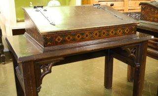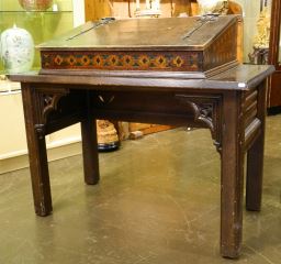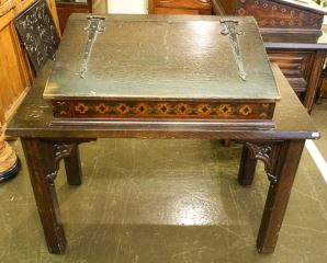 Dark Oak Slope Top Writing Table with Polychrome Features, 39" wide.