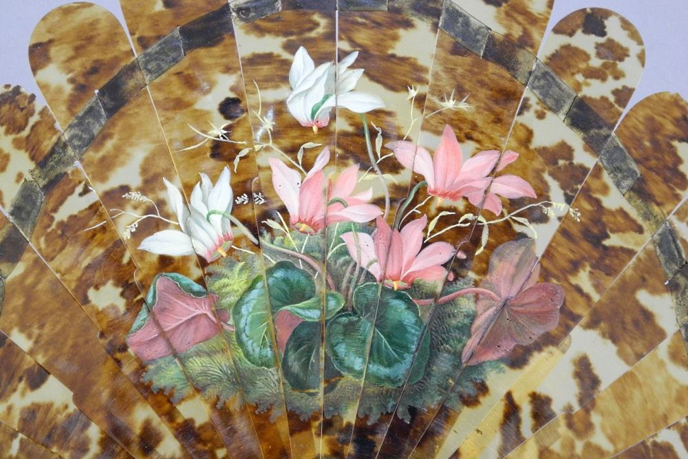19th Century Hand painted Tortoise Shell Fan, 11 1/2" wide, no export.