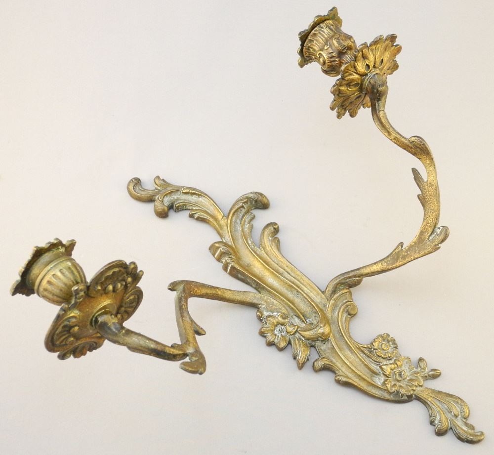 LOT 64 Pair of Louis XV Copper Alloy Scones & Brass Chamber Stick, 8 3/4" length. Estimate: $60 - $100 Sold For: $80 Auction Date: Tuesday, August 31 2021 at 6:00 PM
