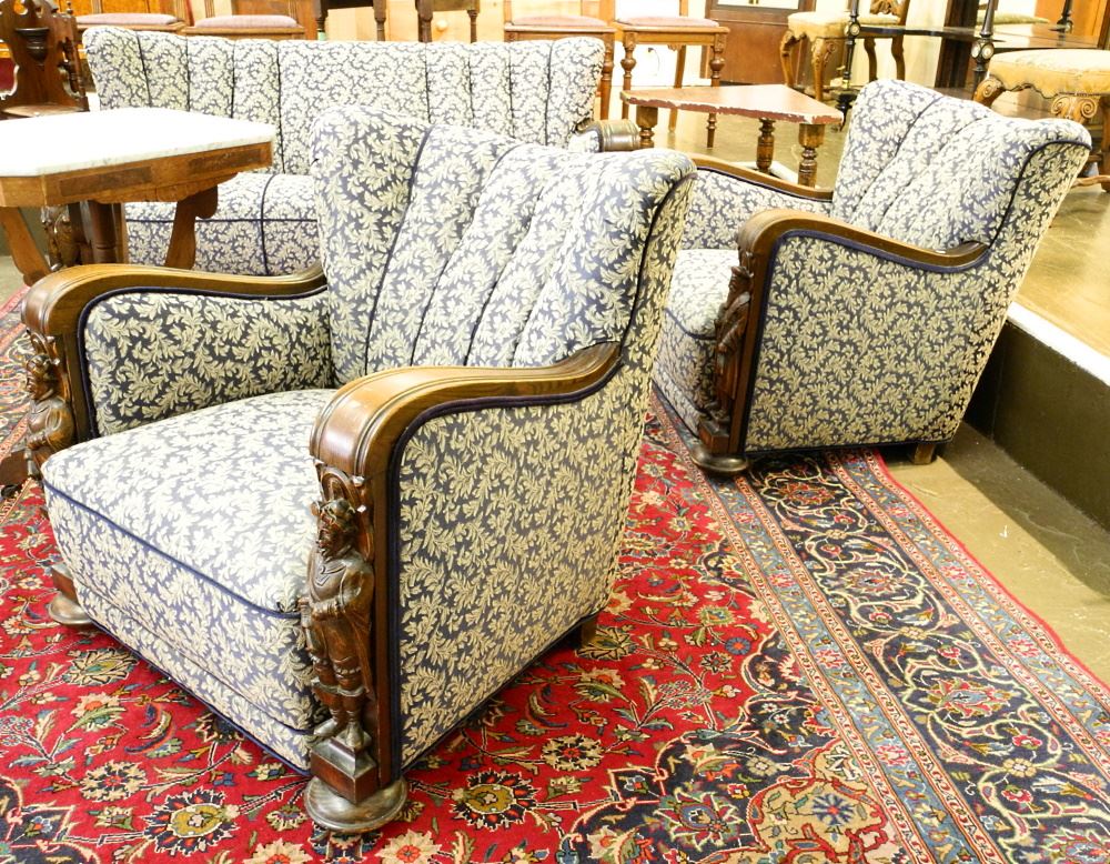 3 Piece Continental Figural Oak Sofa Suite.