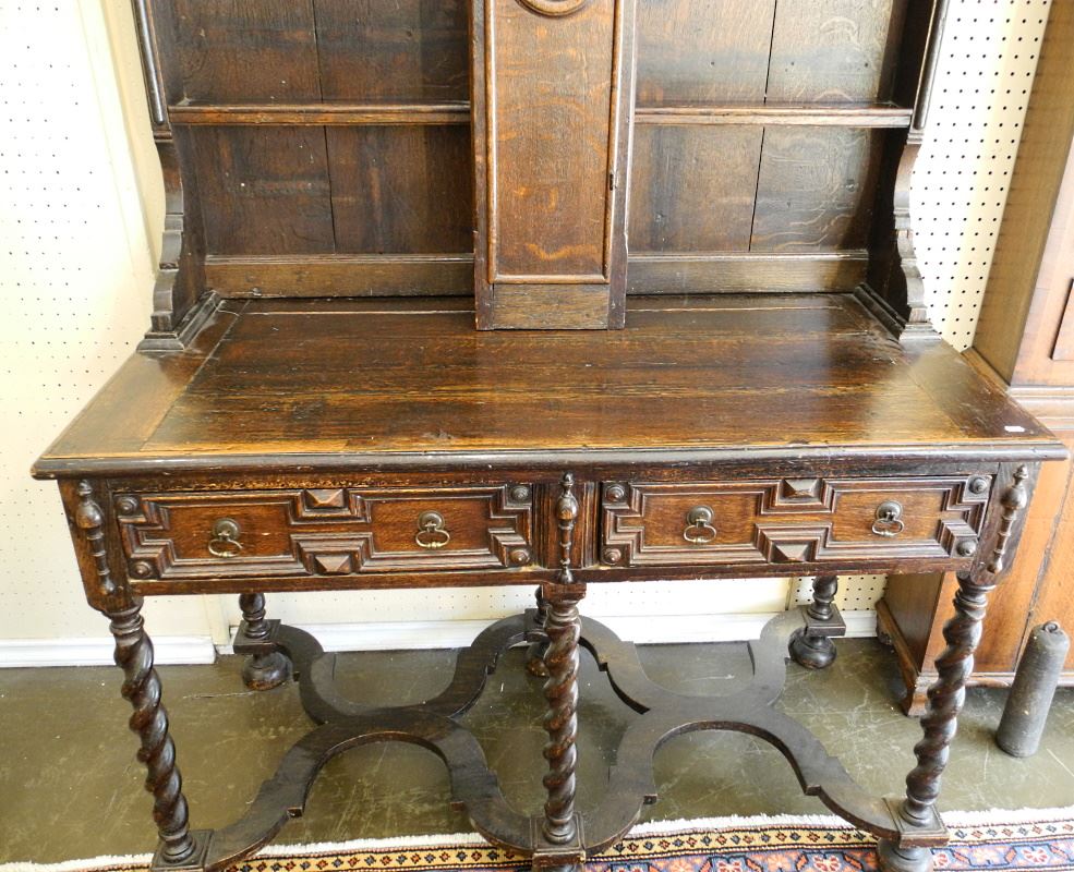 LOT 17 Late 18th - Early 19th Century Oak Barely Twist "Welsh" Dresser, 46 1/2" wide. Estimate: $250 - $500 Auction Date: Tuesday, August 31 2021 at 6:00 PM