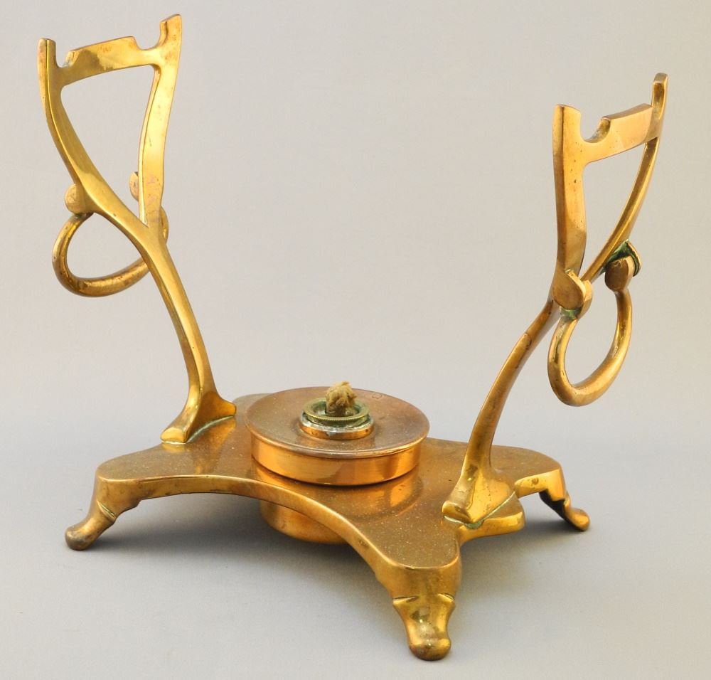 Copper Kettle on Stand with Spirit Burner & Milk Glass Handle, 14" high.