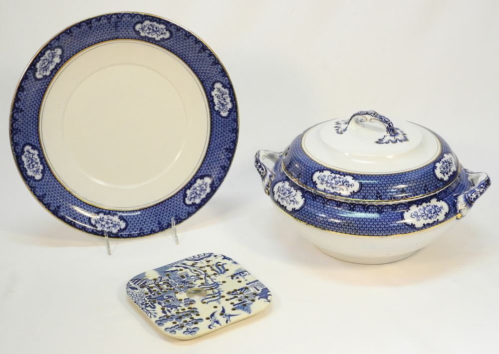 19th Century Blue & White Transfer Plates & a Burslem Tureen, Meat Strainer, tureen 13".