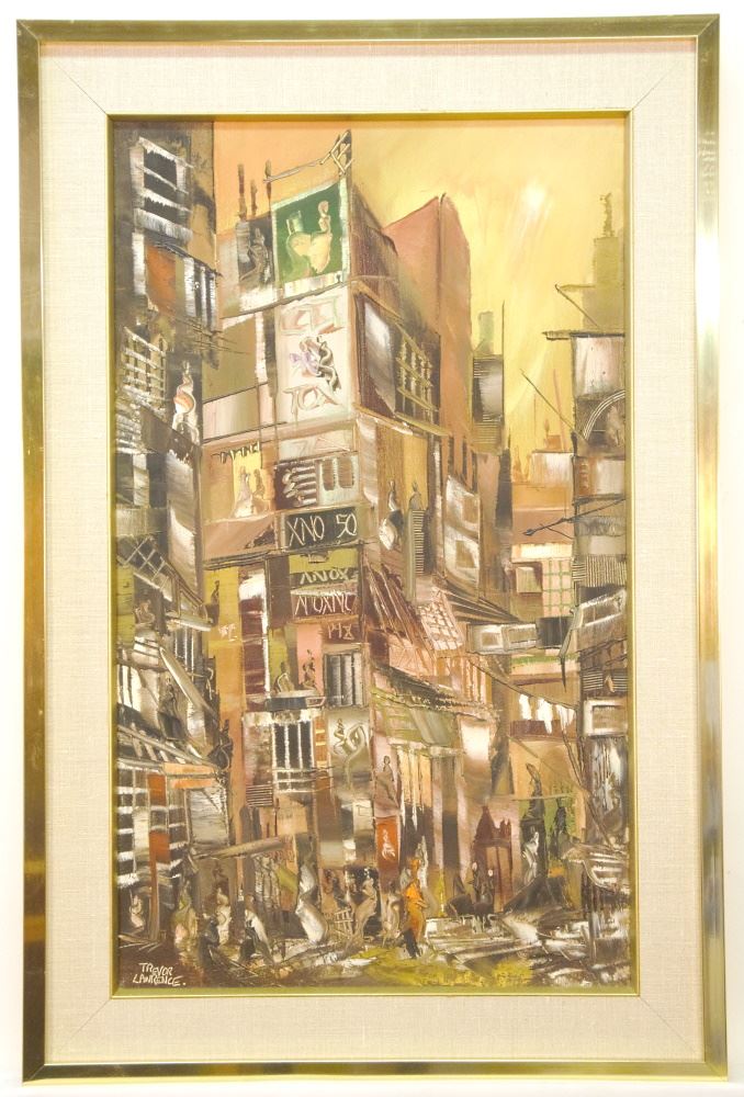 LOT 127 Oil on Canvas signed Trevor Lawrence , 22 1/2" x 14 1/2", "Fantastic Cityscape". Estimate: $100 - $200 Sold For: $90 Auction Date: Tuesday, August 31 2021 at 6:00 PM