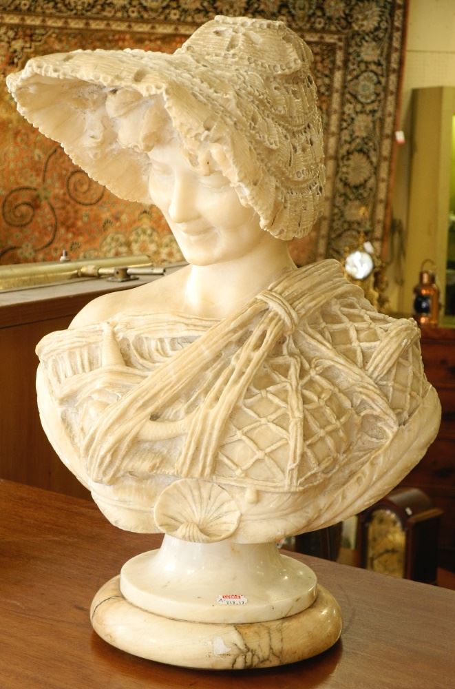 Alabaster Bust of a Young Woman in Bonnet, 18 1/4" high.