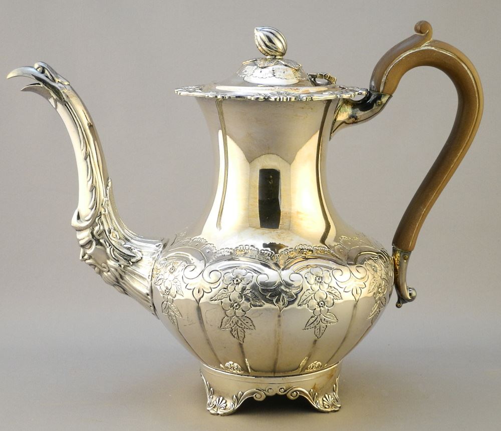 LOT 65 5 Piece Sheffield Reproduction Tea Set & Tray, tray 26 1/2" wide. Estimate: $100 - $200 Sold For: $120 Auction Date: Tuesday, August 31 2021 at 6:00 PM
