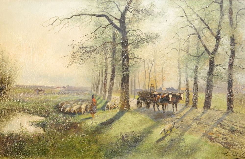 Oil on Canvas signed H. Kuhuck, 16 1/8" x 26 1/4", "Shepherd Observing Cart".