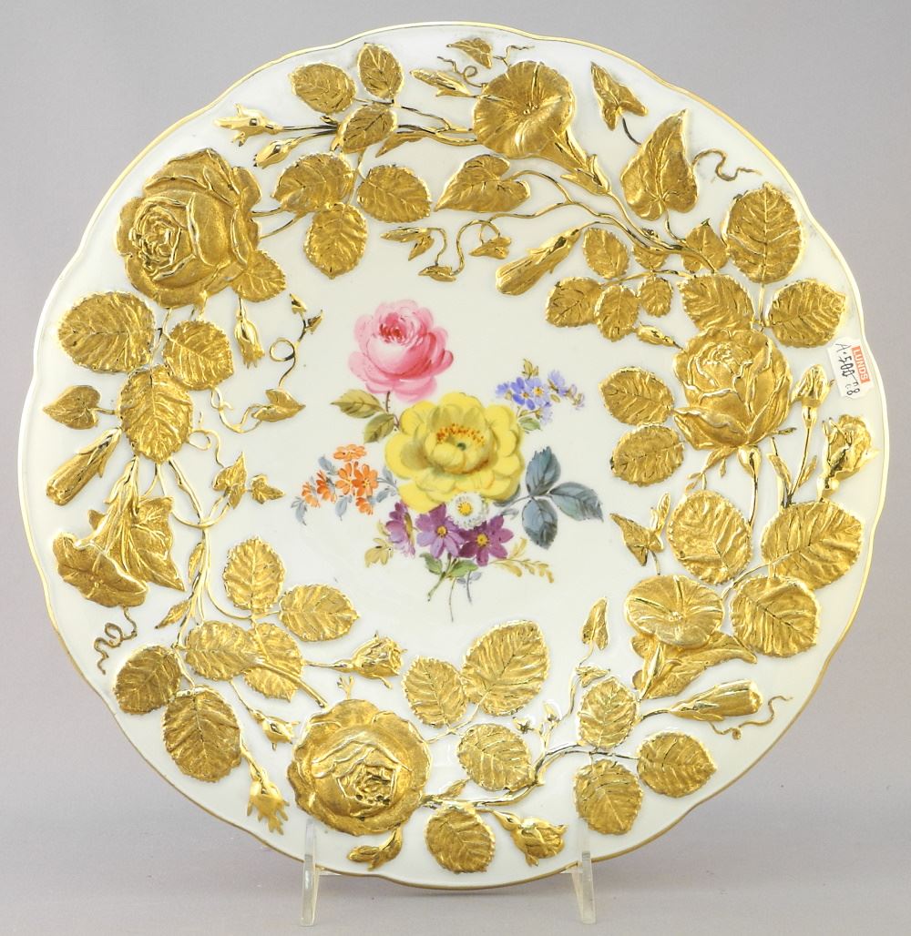 Meissen Gilt Porcelain Dish with Floral Motif, 11 3/4" diameter.