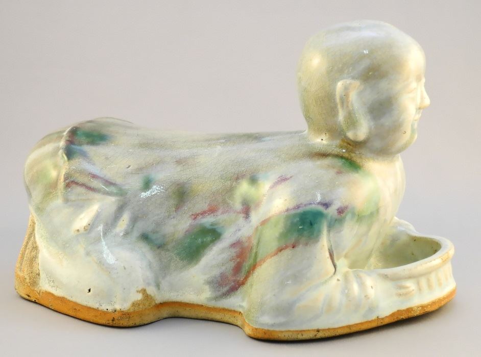 LOT 227 Chinese Porcelain Pillow, Crouching Boy, 10 1/4" length, chip/ crack noted. Estimate: $200 - $400 Auction Date: Tuesday, August 31 2021 at 6:00 PM