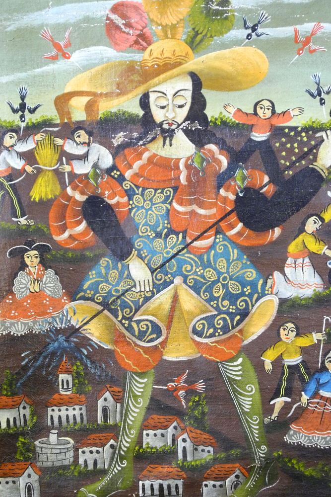 Peruvian Oil on Canvas of an Archangel, 27 x 19", condition noted / losses