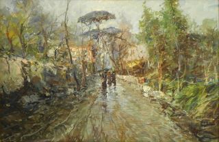LOT 90 Oil on Canvas attributed to Antonio Sansone 22" x 34", "Rain Soaked Railway". Estimate: $150 - $300 Sold For: $460 Auction Date: Tuesday, October 26 2021 at 6:00 PM