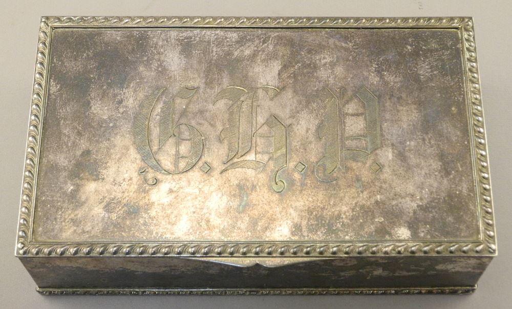 W.M. Carmichael Silver Plated Box monogrammed GMP, includes Sterling Silver Brush, 9 1/2" W.