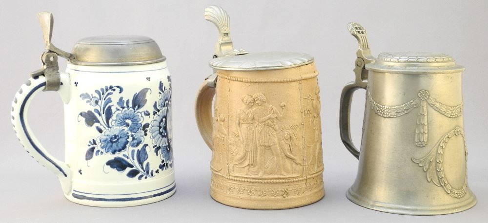 3 Beer Steins: Delft/ Stoneware/ Pewter, Tallest 6 1/2".