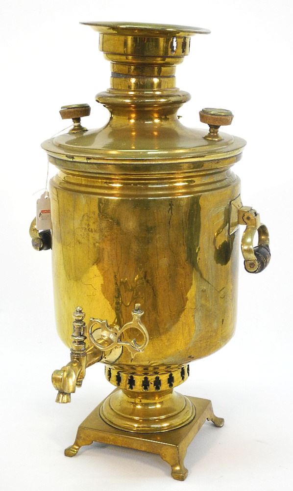 Russian Brass Samovar with Cyrillic Inscription, 19" High.