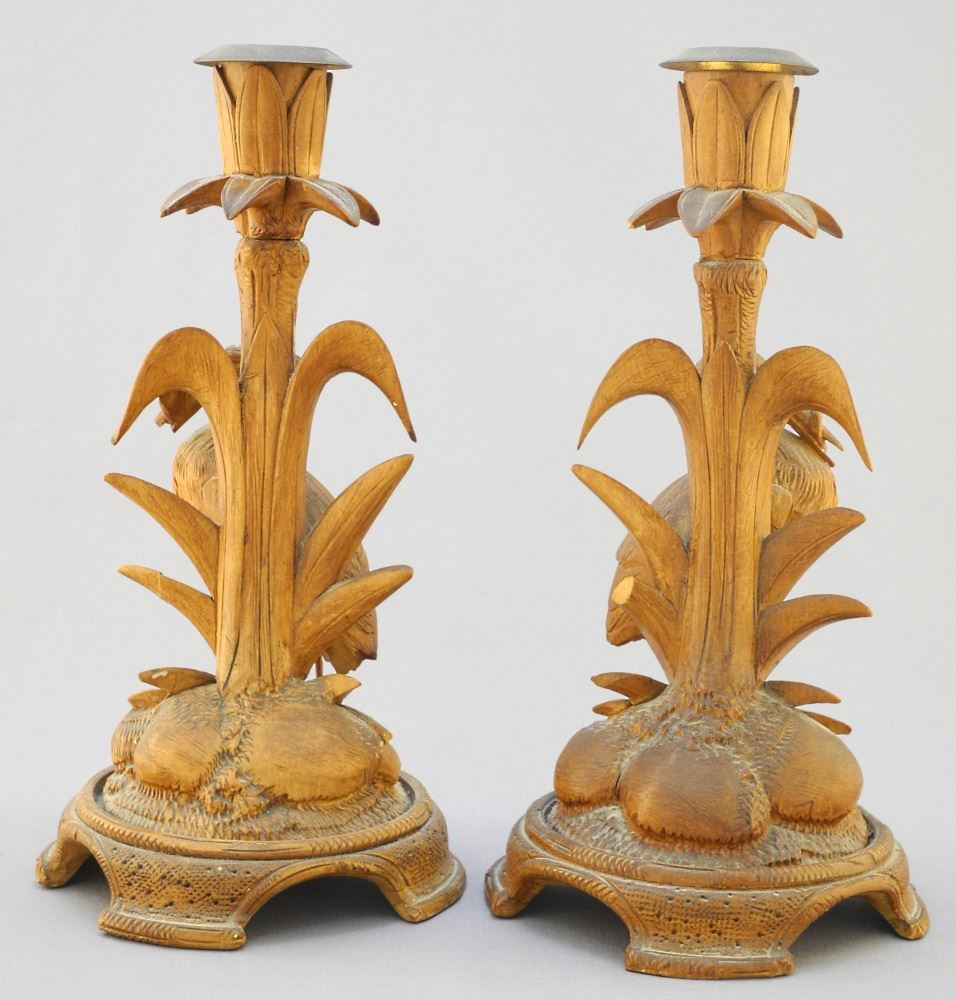 LOT 65 Pair of Black Forest-Style "Heron" Candlesticks (8 1/2"H) & a Similar Pair of Tongs. Estimate: $100 - $200 Auction Date: Tuesday, April 12 2022 at 6:00 PM