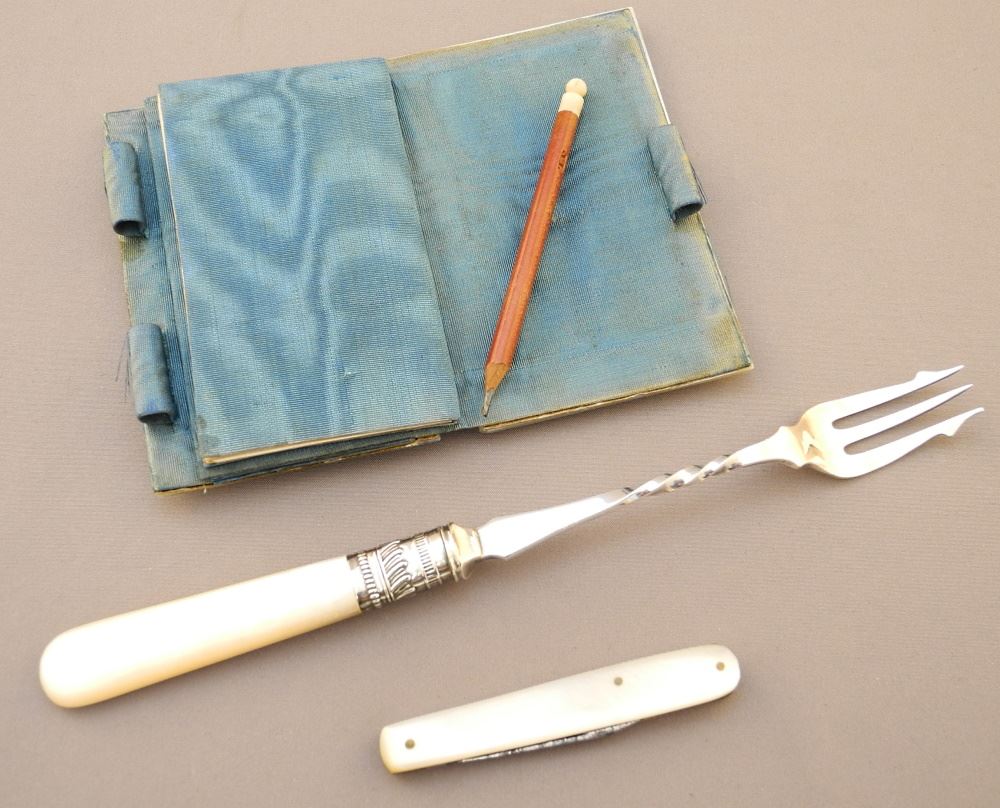 LOT 189 Antique Mother of Pearl Carved Notebook, Pickle Fork & Pocket Knife. Estimate: $100 - $200 Auction Date: Tuesday, April 12 2022 at 6:00 PM