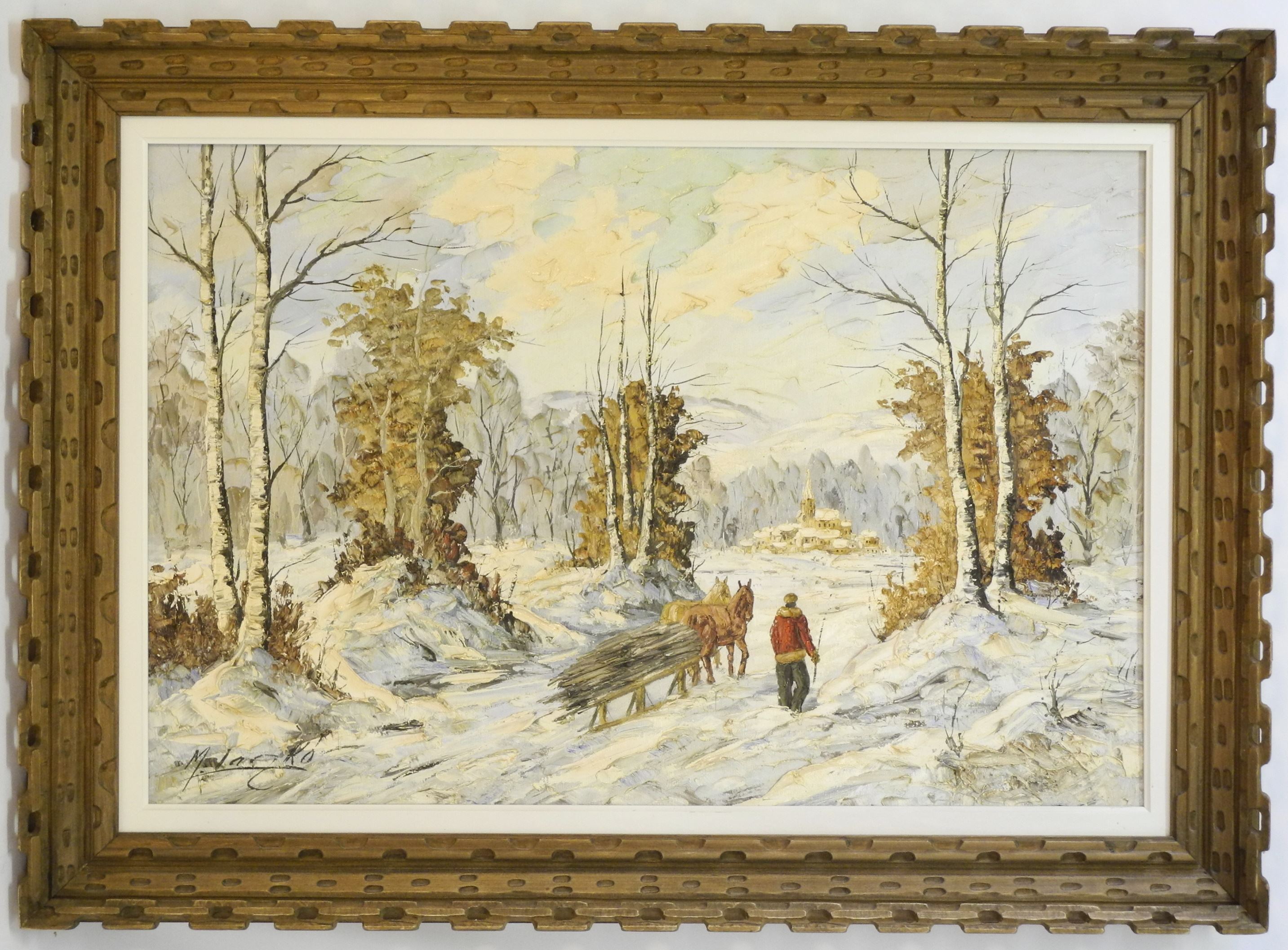 LOT 220 Oil on Canvas Signed M. Laczko, 23 1/4" x 35 1/4", "Hauling Wood in Winter". Estimate: $100 - $200 Sold For: $200 Auction Date: Tuesday, April 12 2022 at 6:00 PM