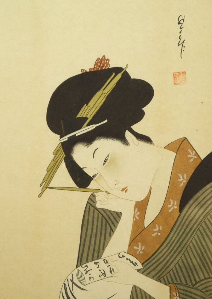 LOT 123 Japanese Ink & Colour on Paper, 21" x 13", "Lady Writing", Signed. Estimate: $100 - $150 Auction Date: Tuesday, April 12 2022 at 6:00 PM