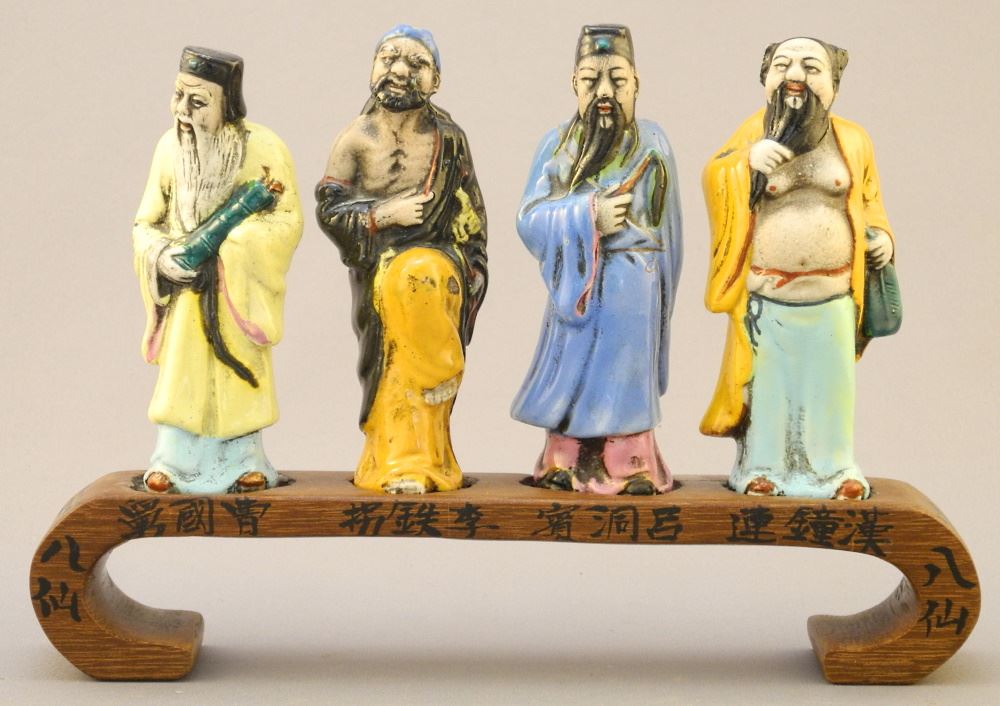 LOT 127 Eight Chinese Pang Tao Eight Fairies Figures on Stands with Folding Book, 1 restored Estimate: $150 - $300 Sold For: $70 Auction Date: Tuesday, April 12 2022 at 6:00 PM