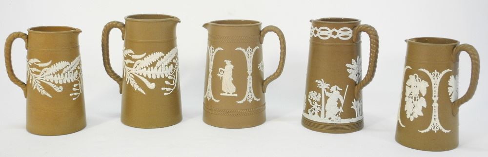 LOT 153 8 Dudson Jasperware Brown & White Pitchers. Estimate: $150 - $300 Sold For: $90 Auction Date: Tuesday, April 12 2022 at 6:00 PM