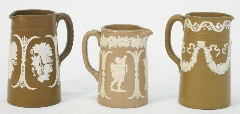 LOT 153 8 Dudson Jasperware Brown & White Pitchers. Estimate: $150 - $300 Sold For: $90 Auction Date: Tuesday, April 12 2022 at 6:00 PM