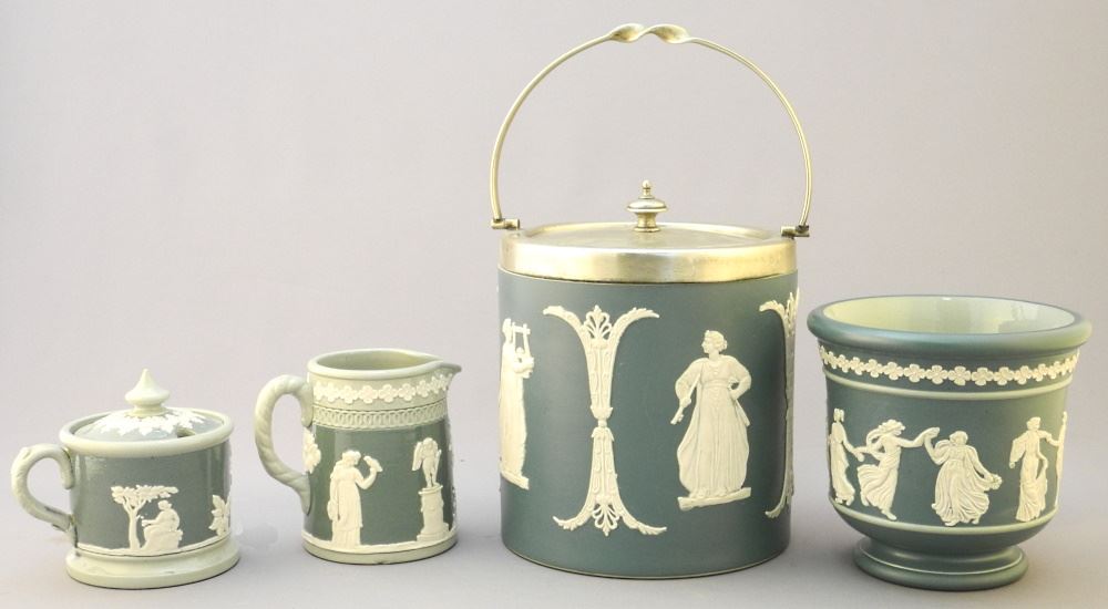 LOT 45 4 Dudson Jasperware Green & White Items: Biscuit Jar, Jardiniere & Cream & Sugar, 6 1/4". Estimate: $60 - $90 Sold For: $30 Auction Date: Tuesday, April 12 2022 at 6:00 PM