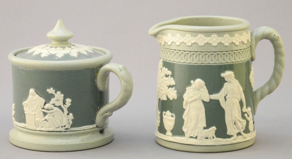 4 Dudson Jasperware Green & White Items: Biscuit Jar, Jardiniere & Cream & Sugar, 6 1/4".