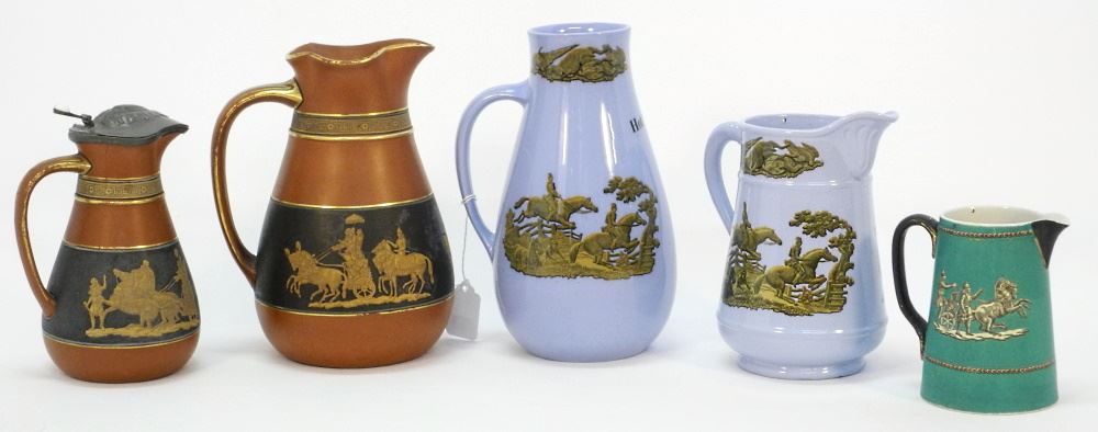 Collection of 5 Prattware Pitchers, Highest 9 1/2" High.