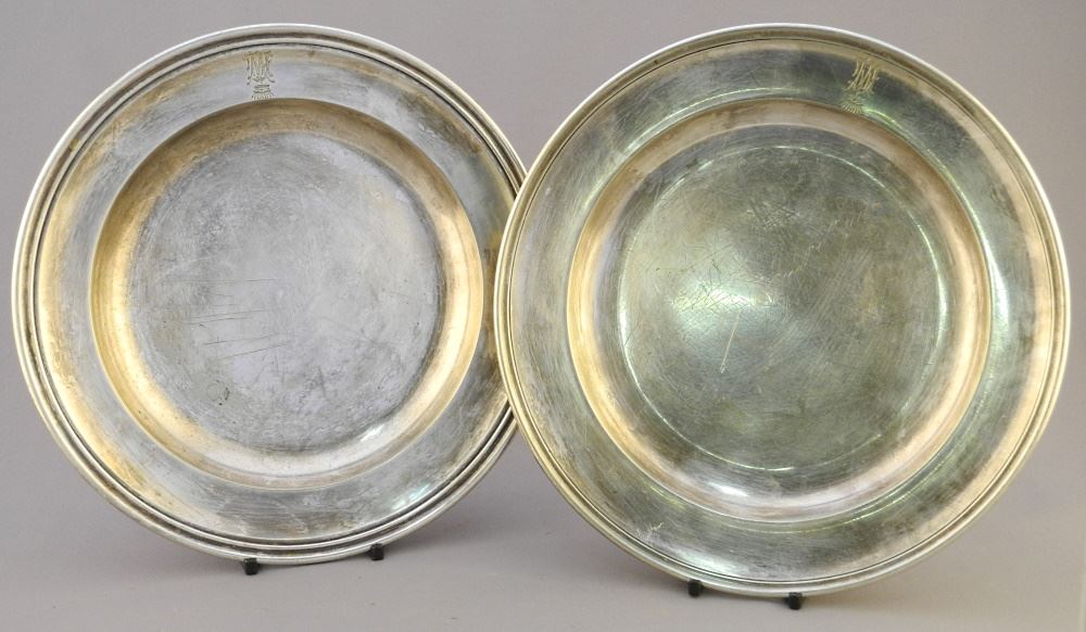 LOT 195 Pair of Monogrammed Silver Plated Plates, 9 1/8" Diameter. Estimate: $50 - $60 Auction Date: Tuesday, April 12 2022 at 6:00 PM