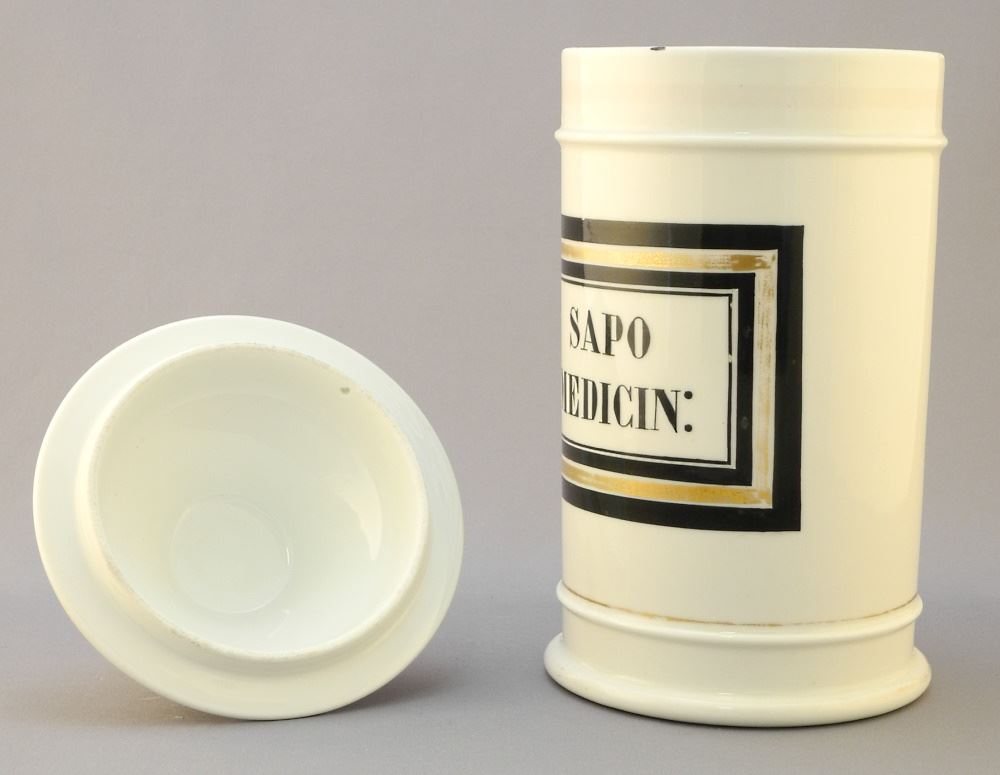 19th Century French Porcelain "Sapo" Apothecary Jar, 10 3/4" high.