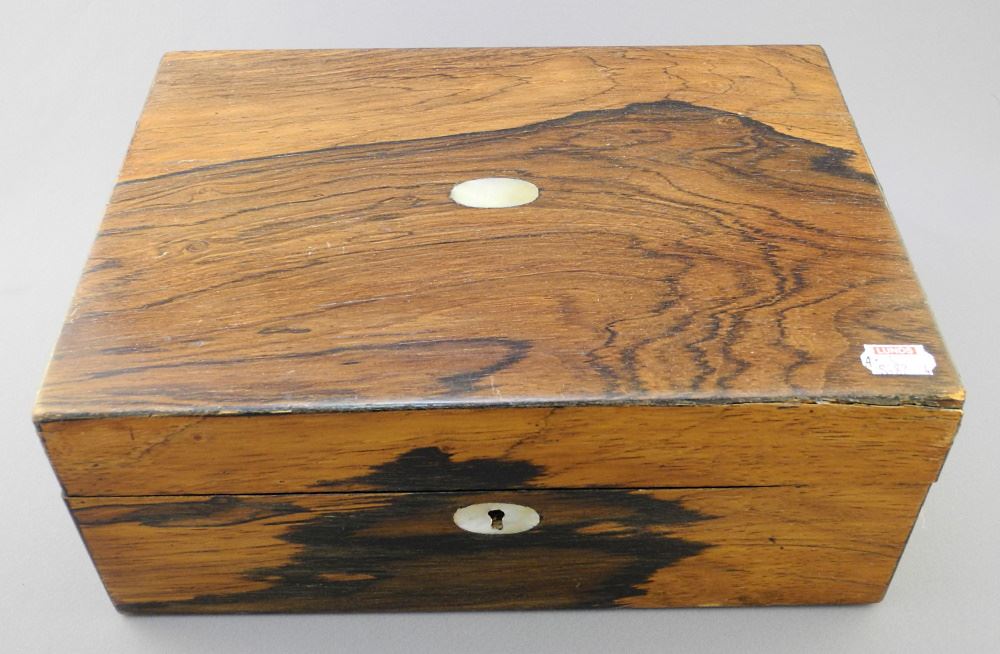 LOT 59 19th Century Rosewood Sewing Box, 4 1/4" x 10 3/4" x 7 3/4". Estimate: $60 - $100 Sold For: $120 Auction Date: Tuesday, October 25 2022 at 6:00 PM