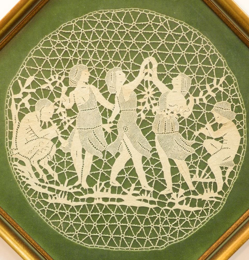 Antique Lace Panel "Three Graces", 15 3/4" Diameter, Framed.