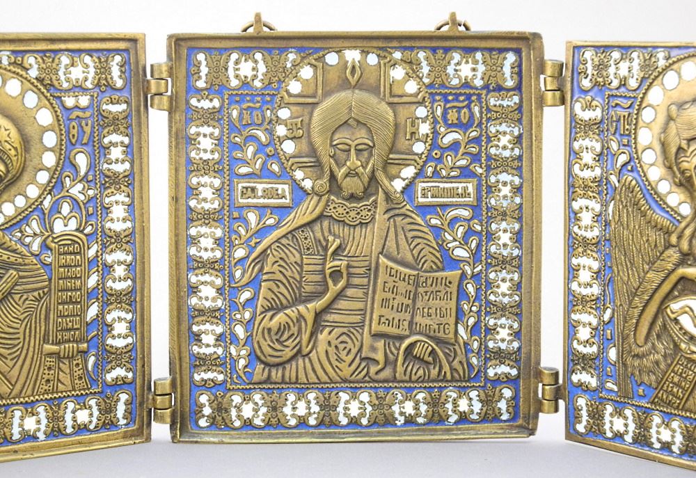 19th Century Russian Bronze Triptych with 3 Colour Enamel, 6" x 15 1/2",