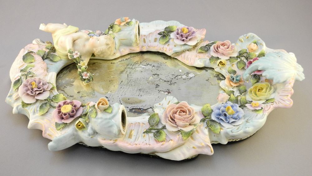 Dresden Porcelain Table Mirror, As Found/ Damage Noted, 16" High.