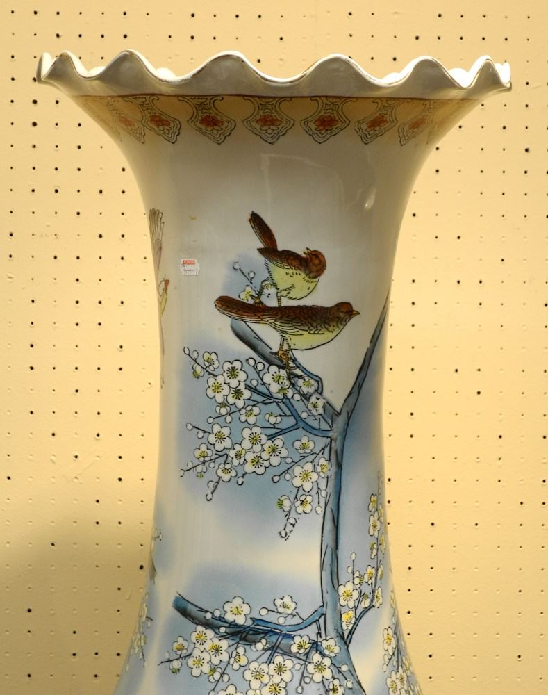 Chinese Porcelain Temple Vase, Birds & Prunus Bough, 62 1/2" High.