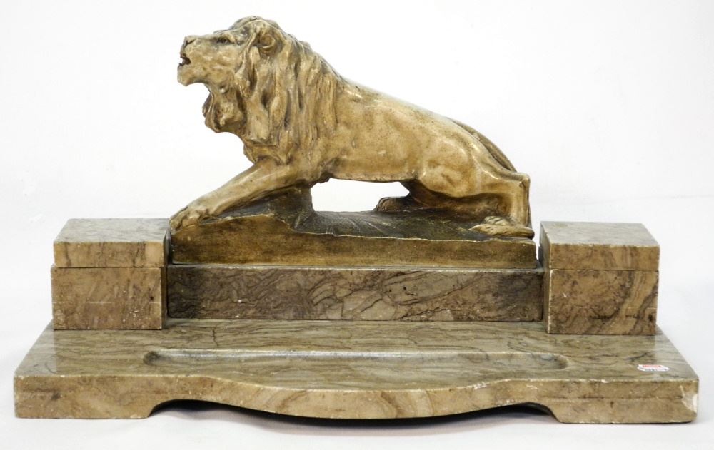 Marble & Cast Plaster "Lion" Inkwell 10" x 18 1/4" x 10 3/4".