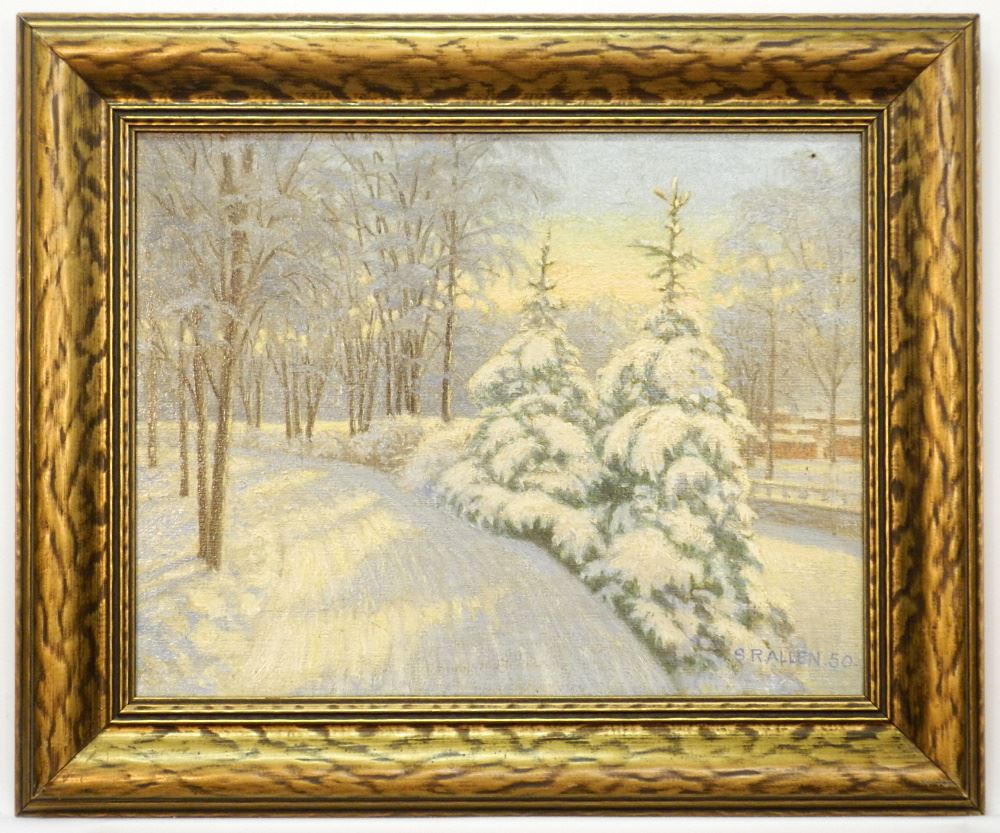 Oil on Canvas Signed S.R. Allen '50, 14 1/4" x 18 1/4", "Winter Scene".