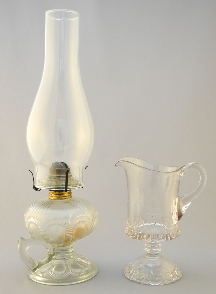 3 Pieces Adam & Company "Apollo" Pressed Glass Wares (Cake Plate Re- Stored) & a Lamp.