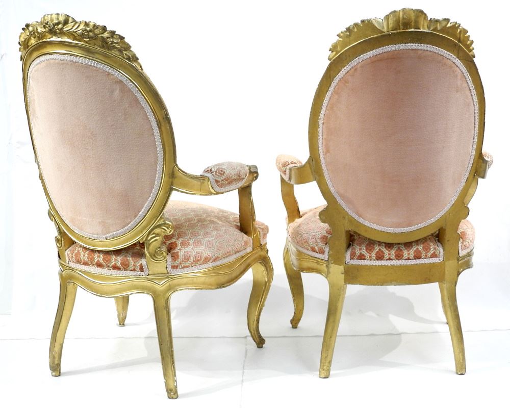 Pair of Louis XV Cameo Back Gilt Wood Armchairs, 41 1/2" High.