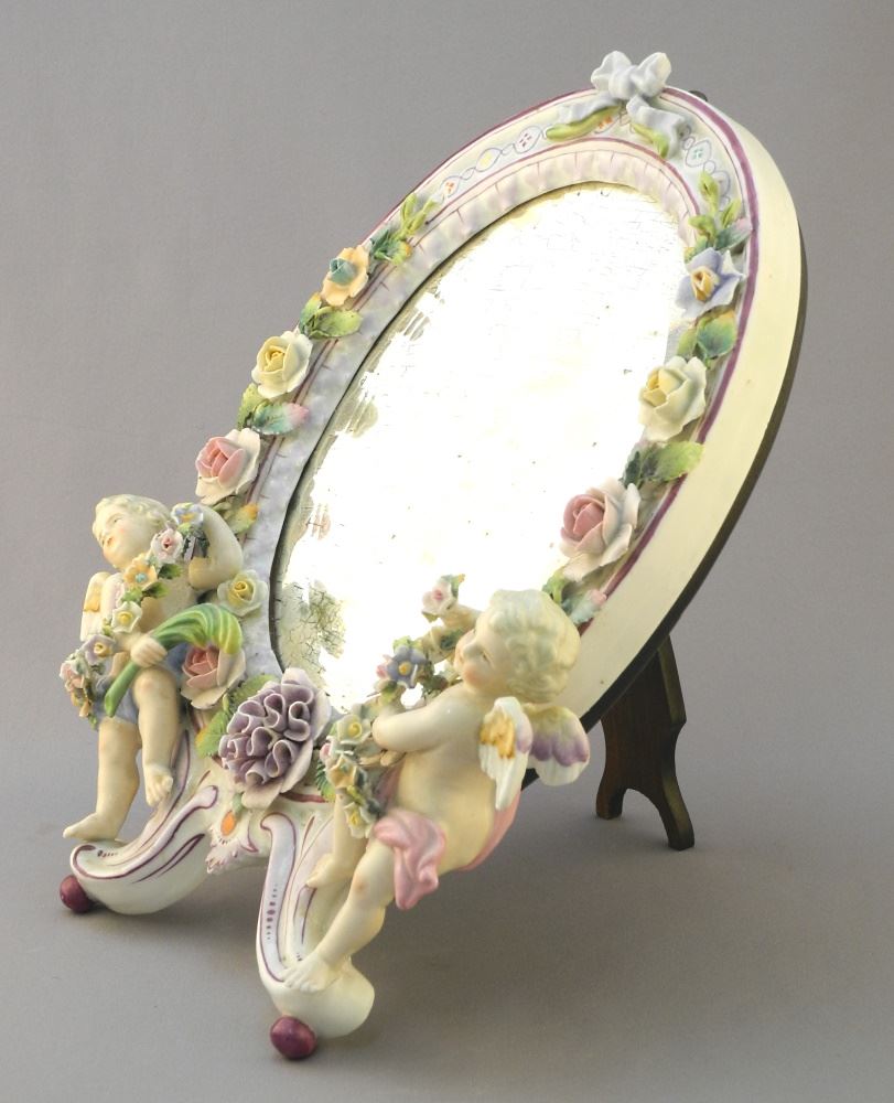 European Porcelain Figural Dresser Mirror, 12" x 8 3/4" x 2 3/8", Chips & Desilvering Noted.