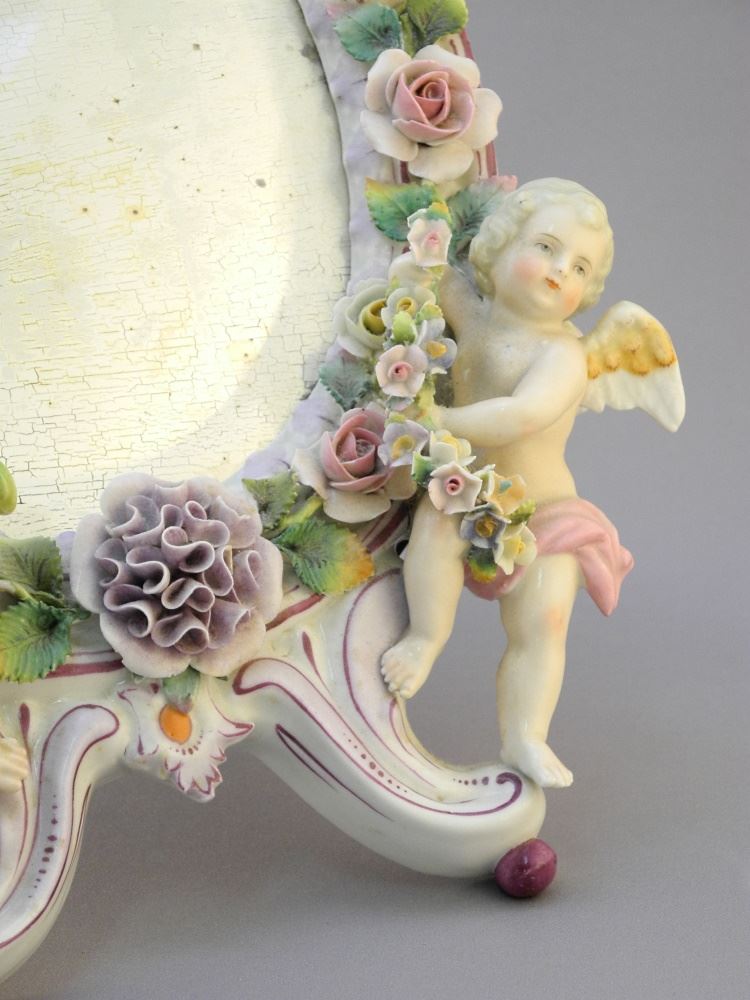 LOT 21 European Porcelain Figural Dresser Mirror, 12" x 8 3/4" x 2 3/8", Chips & Desilvering Noted. Estimate: $100 - $140 Auction Date: Tuesday, October 25 2022 at 6:00 PM