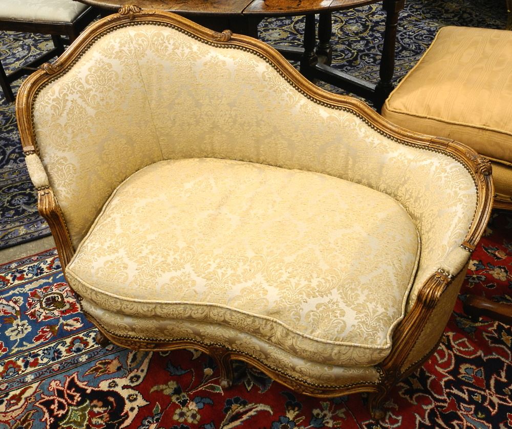LOT 93 Miniature Fruitwood Settee, 44 1/2" wide. Estimate: $300 - $400 Sold For: $475 Auction Date: Tuesday, October 25 2022 at 6:00 PM