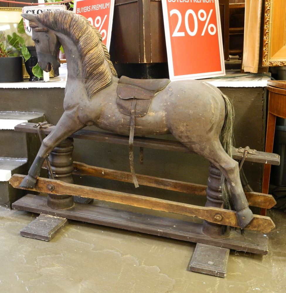 LOT 325 19th Century Victorian Hand Carved Wooden Rocking Horse, 50" Length. Estimate: $200 - $400 Sold For: $120 Auction Date: Tuesday, October 25 2022 at 6:00 PM
