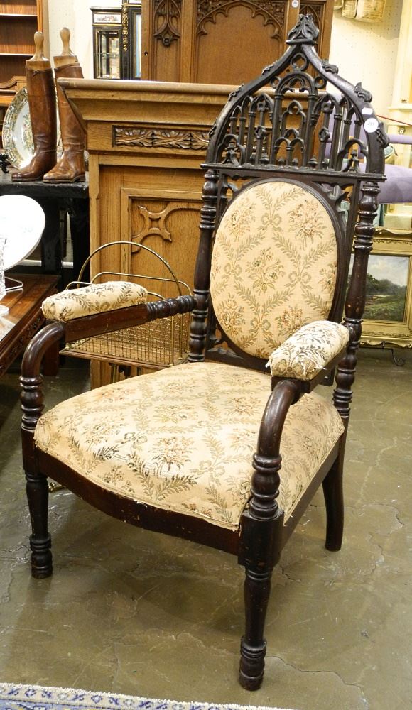 LOT 281 Ornate European Armchair, Acquired Maine 1960's, 49 1/2 x 25 1/2 x 24". Estimate: $300 - $400 Sold For: $275 Auction Date: Tuesday, October 25 2022 at 6:00 PM