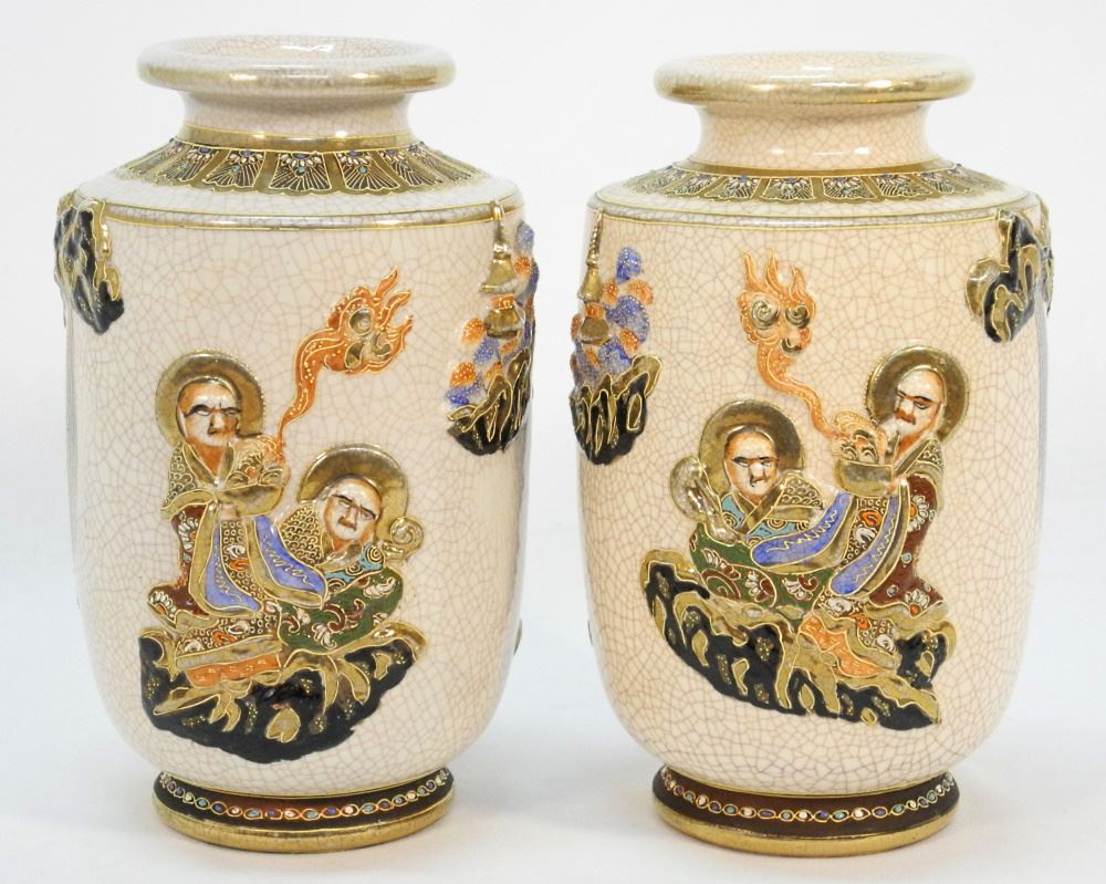LOT 127 Pair of Satsuma Vases with Molded Figures, 10" high. Estimate: $100 - $200 Auction Date: Tuesday, February 21 2023 at 4:00 PM
